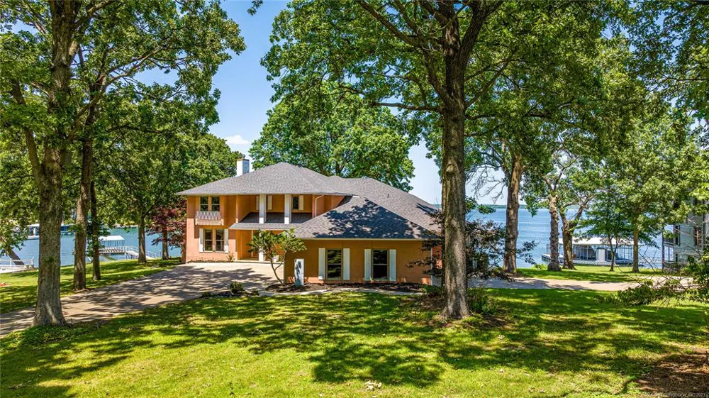 This gorgeous waterfront home at Grand Lake is on point! The home features almost 250' feet of shoreline, a gentle slope to the water, private dock, lake views for miles, and a detached garage/workshop for all of your lake toys. The primary suite includes a large sunroom to soak in the gorgeous views, a luxurious primary bath and large walk-in closet. Other features not to be overlooked are a two year old roof, spider/wasp spray system, 2x6 outside walls, irrigation system, instant hot water and automatic lights in most closets.